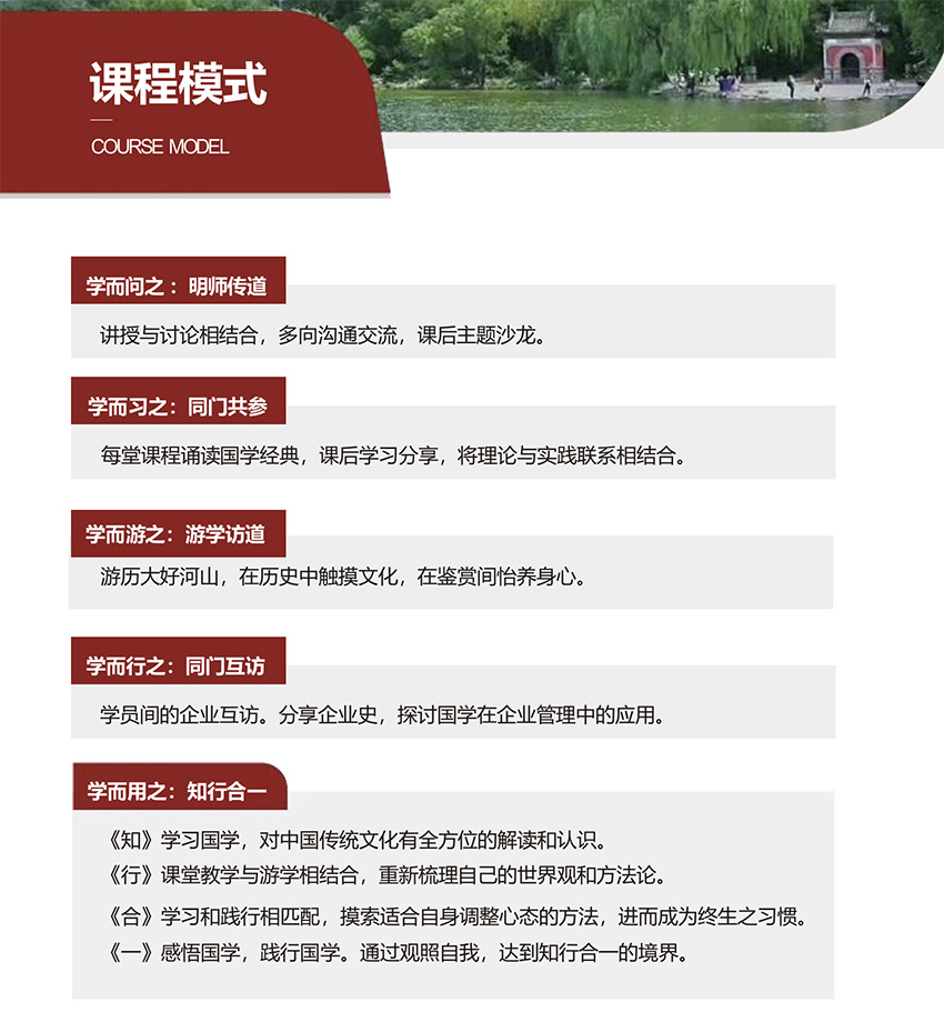 在新一代国学教育体系中,北京大学深圳研究院经过系统性教学研究,深度研发出符合当代企业经营者真实需求的全新国学管理培育项目—北京大学国学商道精修班;本项目不但延续国学教学体系内容,同时兼顾企业家在经营与管理落地过程中的实际应用,旨在推动中华文化的伟大复兴,推动中国传统思想文化的现实落地,彰显体现着中华民族世世代代在生产生活中形成和传承的世界观、人生观、价值观、审美观等,推动中国企业家修齐治平、尊时守位、知常达变、开物成务。