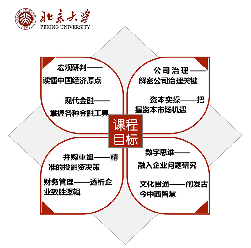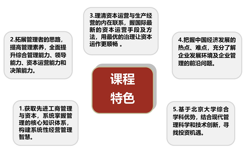 “北京大学公司治理与资本运营研修班”在EMBA课程体系的基础上进行设计,邀请国 内高校知名专家学者、知名企业家与行业标杆创新实践者联袂授课,引入现代公司管理与 资本运营高端课程,聚焦企业、市场的良性互动,借鉴国内外创新标杆型企业案例,多维度、全方面带领中国成长型企业领头人及高层管理人员,纵览全球经济大局,细梳中国企 业现状。结合全球知名的企业管理理念和中国本土企业管理方法,帮助学员优化公司治理、 拓展资本视野、正确投融资决策。对个人以及企业进行全面的提升,帮助学员占据行业金 融高地,在新常态下助力企业的新发展!