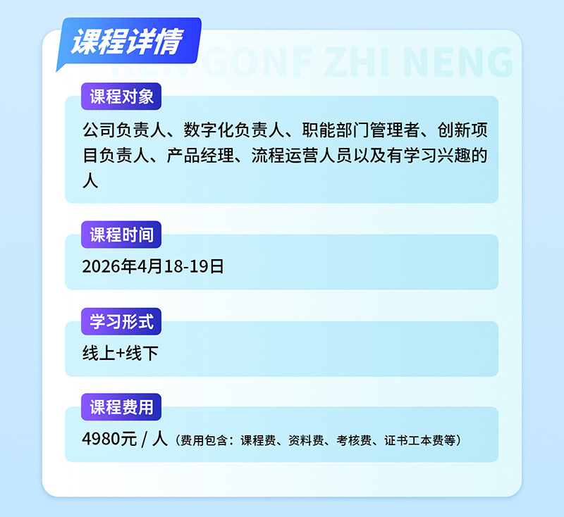 公司负责人、数字化负责人、职能部门管理者、创新项目负责人、产品经理、流程运营人员以及有学习兴趣的相关人员。