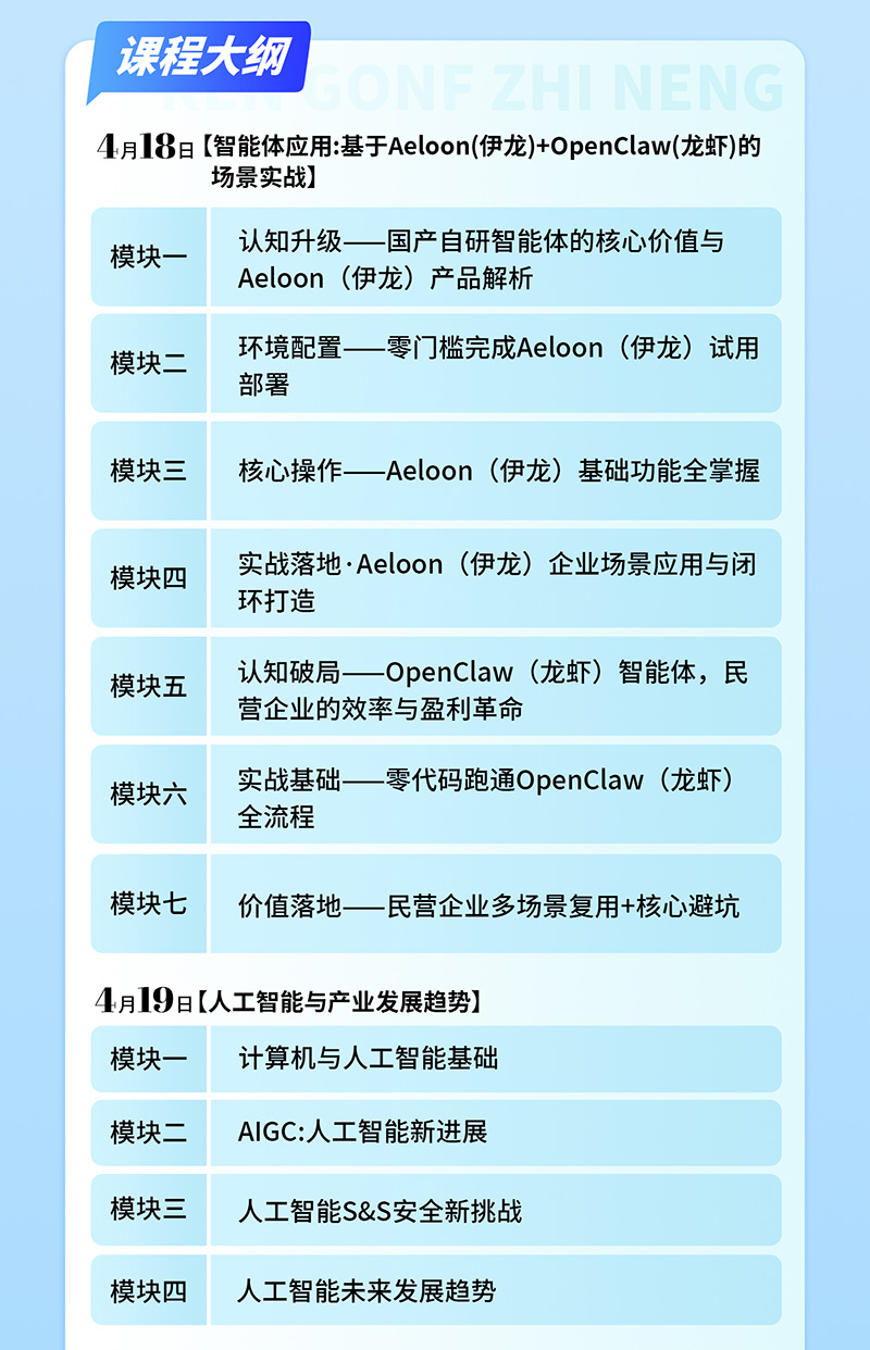 本课程以企业业务场景为核心,以Aeloon(伊龙)+OpenClaw(龙虾)为代表案例,帮助学员理解智能体的基本原理、应用边界、搭建方法与落地步骤。课程将围绕"认知建立、场景识别、架构设计、演示体验、搭建思路、治理规范"展开,帮助学员建立企业智能体项目的整体视角,了解全球AI产业动态,解析智能体在制造、医疗、金融等领域的落地路径,并掌握一套可用于后续试点推进的课程框架。