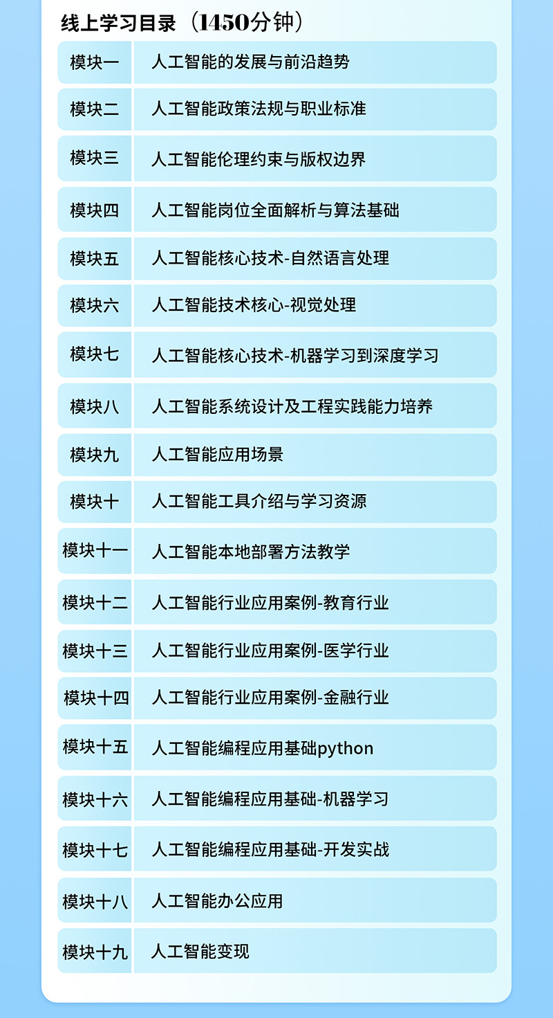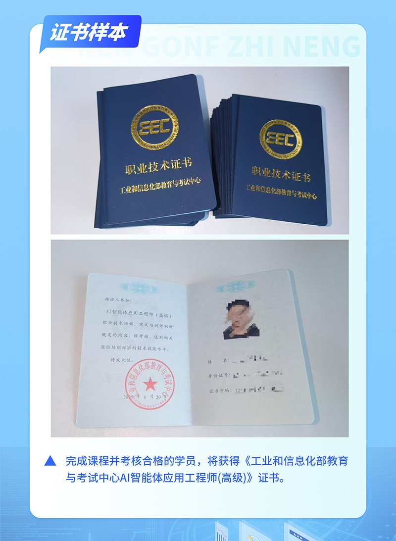 - 获得权威认证与背书:完成课程并考核合格的学员,将获得《工业和信息化部教育与考试中心AI智能体应用工程师(高级)》证书。
