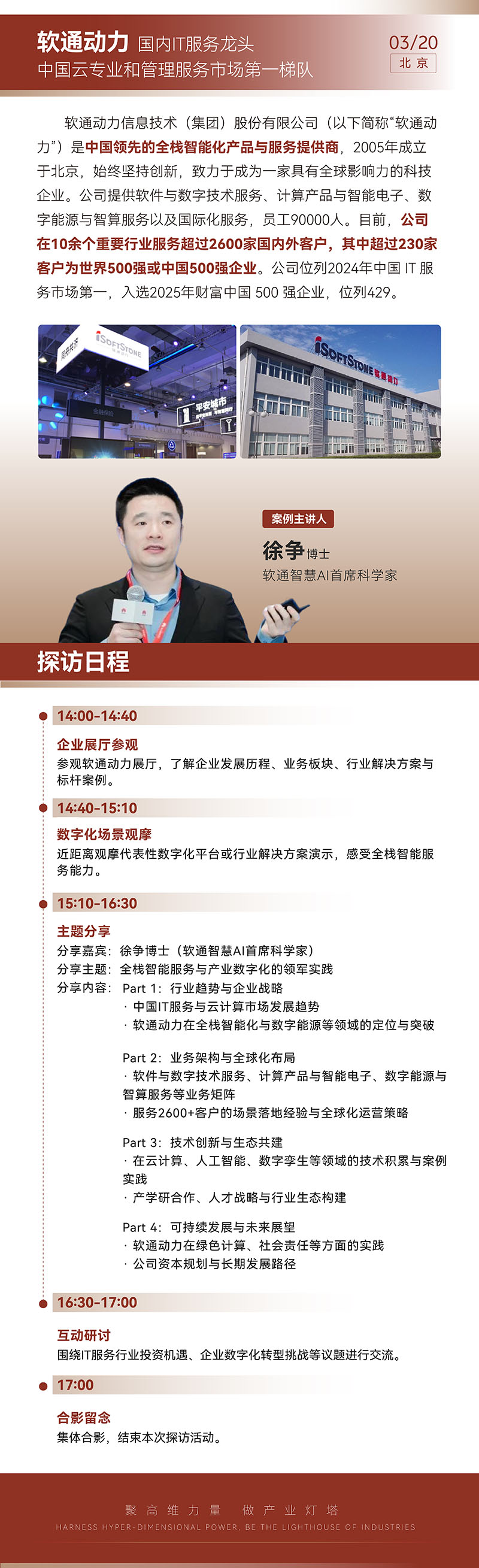 本次探访适合:企业高管(CEO、CIO、CTO、数字化转型负责人)——学习头部企业数字化转型路径与全栈智能化布局;投资机构从业者——把握IT服务行业投资机遇,了解云计算、数字能源等赛道发展趋势;产业链上下游企业——探索与软通动力的生态合作机会;学术研究及咨询顾问——获取一手行业案例与前沿实践数据。