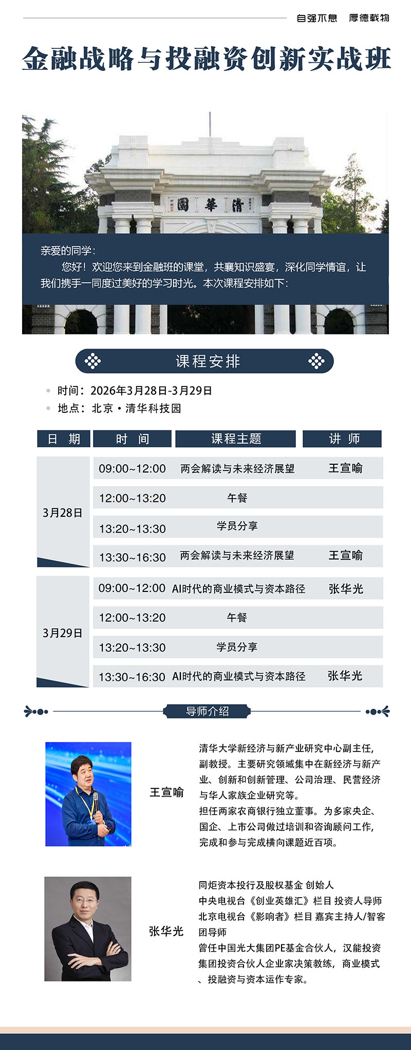 2天课程核心收获:第一天建立宏观政策敏感度,掌握两会解读框架与经济趋势研判方法;第二天获得AI时代资本运作实战工具,包括商业模式设计、估值模型、融资策略、投资人沟通技巧等;全程在清华科技园的创新创业氛围中,与来自各行业的企业家、投资人建立高端人脉网络,获得持续学习与资源对接机会。