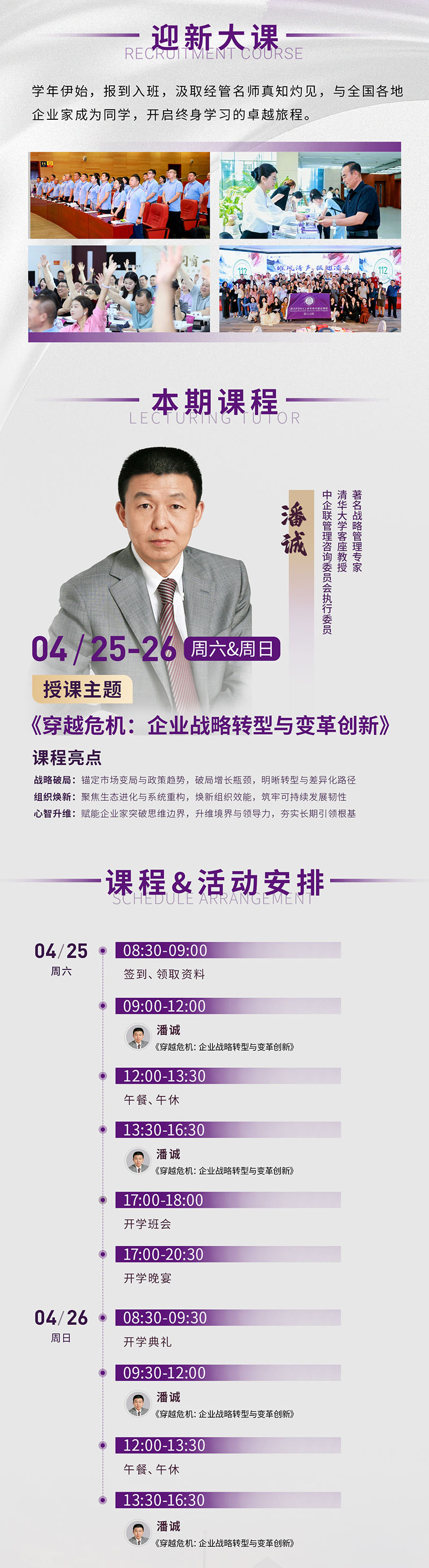 | 13:30-16:30 | 潘诚《穿越危机:企业战略转型与变革创新》 | 潘诚《穿越危机:企业战略转型与变革创新》 |