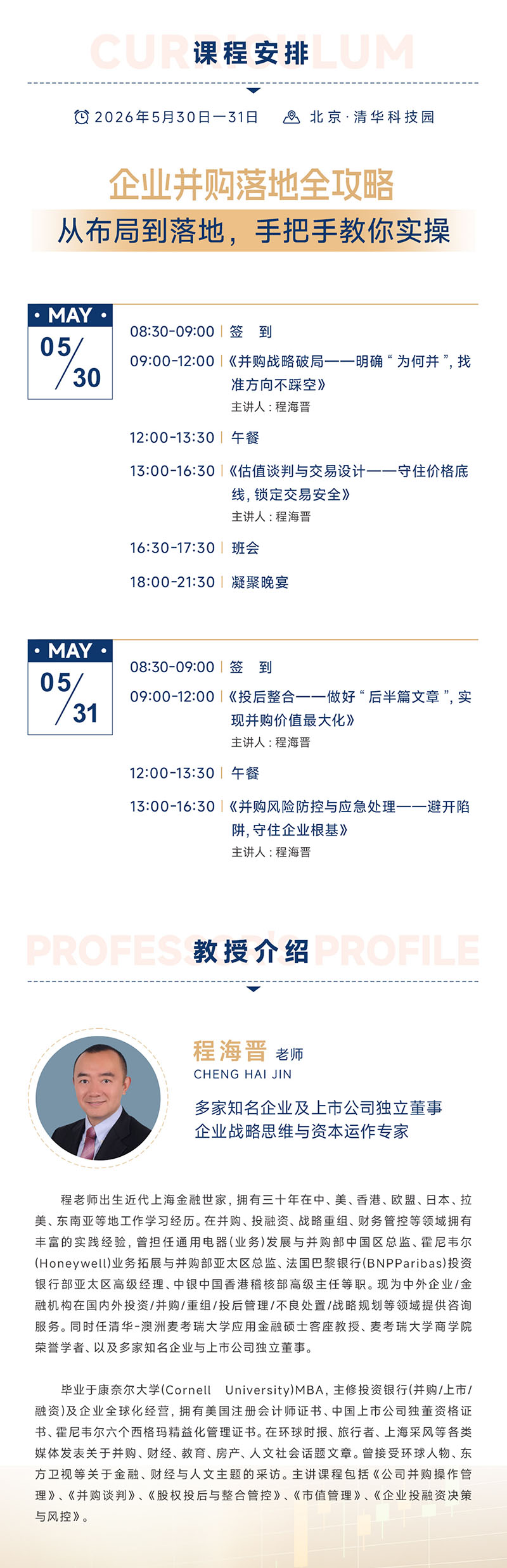程海晋老师出身近代上海金融世家,拥有三十年跨国并购实战经验,曾担任通用电气发展与并购部中国区总监、霍尼韦尔业务拓展与并购部亚太区总监、法国巴黎银行投资银行部亚太区高级经理等核心职位,现为多家知名企业与上市公司独立董事。不同于纯理论讲授,程老师基于在中、美、香港、欧盟、日本、拉美、东南亚等地的丰富实操经验,从"为何并"的战略破局到"后半篇文章"的投后整合,手把手教授并购全流程落地方法。课程设计聚焦企业家听得懂、用得上的投融资实战课,帮助学员避开并购陷阱,守住企业根基。